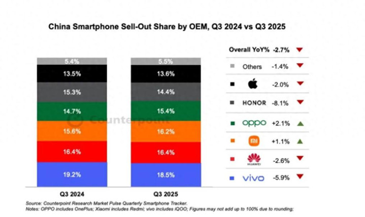 vivo还是第一,这个正常,vivo的中端机和入门机销量,都是国内市场基本上没有什么对手,而且vivo应该就是今年的国内销量第一,没有意外。第二是华为,其实看和去年差不多份额,但原生鸿蒙系统还是对产品有影响的,但也没有很多人想象的下滑那么大。不知道第四季度的销量,基本上主要产品是华为是没有什么特别便宜的手机,第三季度基本上靠nova14和pura80pro以及mate70系列的销量为主,所以华为的入门机应该需要更新了。