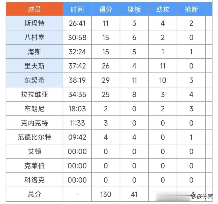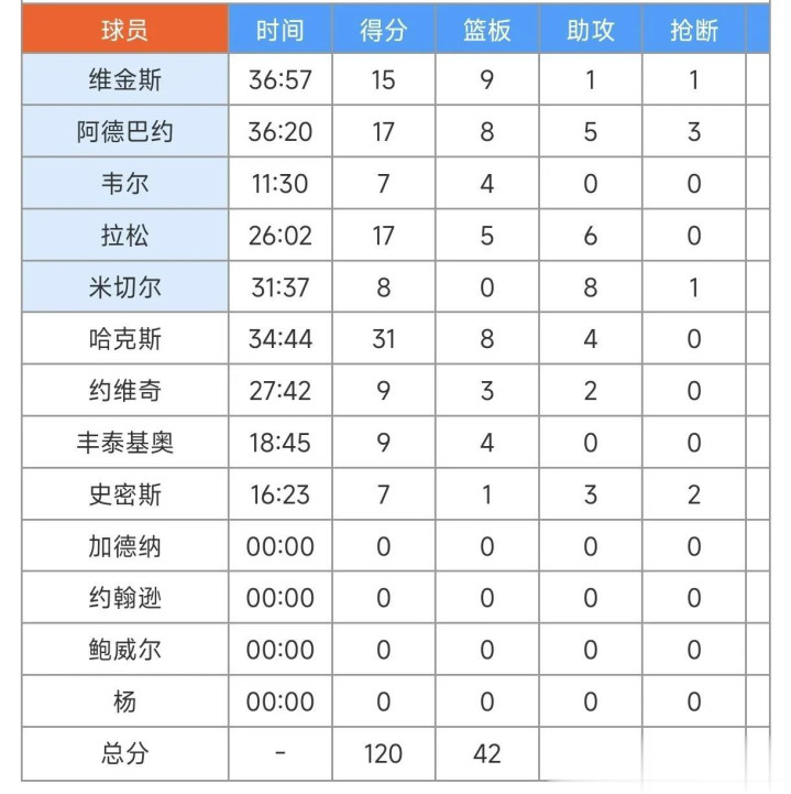 比赛数据,维金斯拿到15分,阿德巴约拿到17分,哈克斯拿到31分,海斯15分,八村塁15分,东契奇29分,里弗斯26分,拉拉维亚25分,斯玛特11分,布朗尼2分3断,克内克特3分。